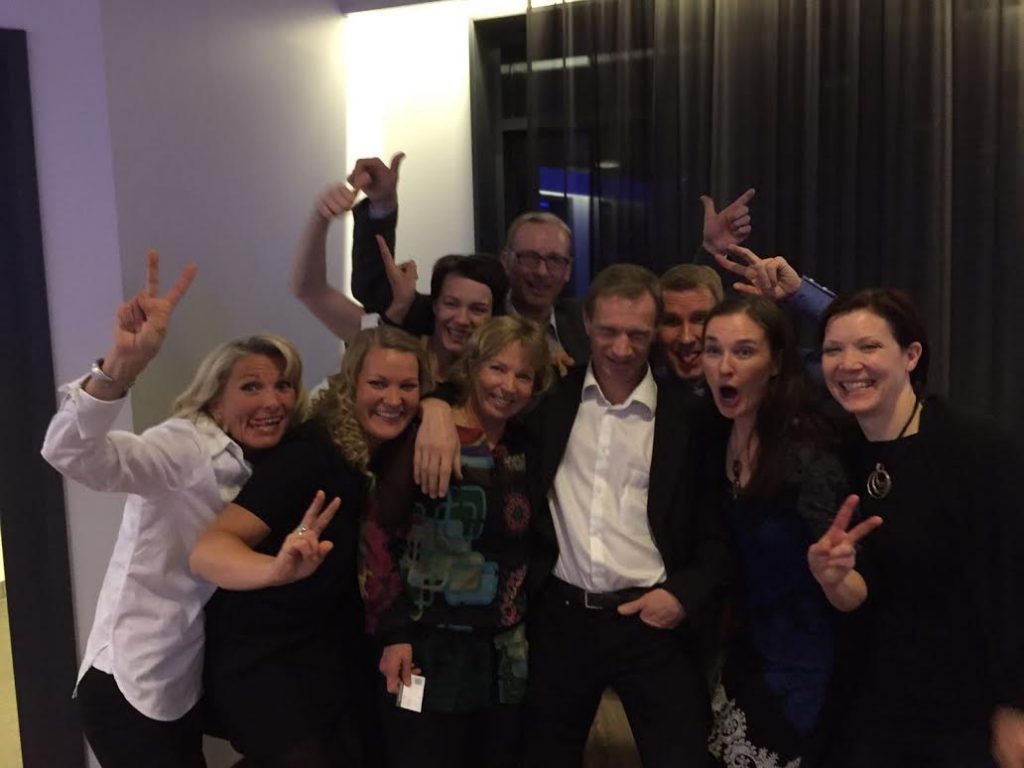 Illallisella koko Team Levi – eli nykyisiä ja entisiä tiimikavereita bilettämässä.