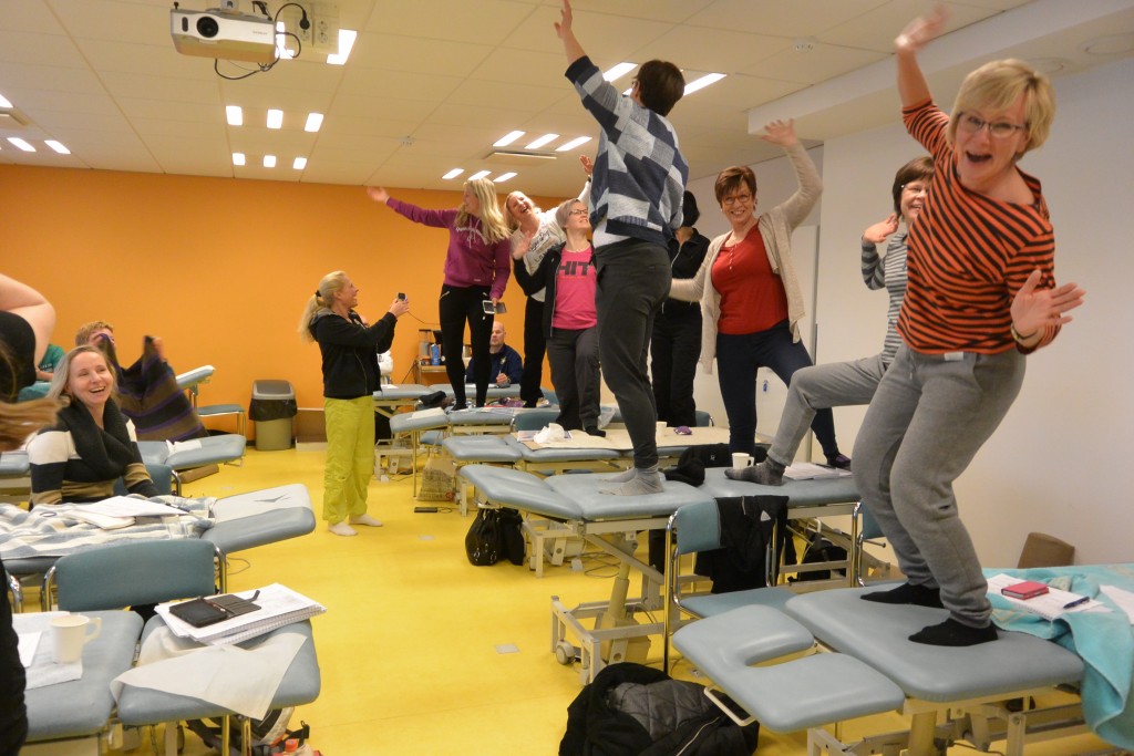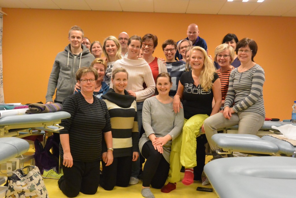Faskiamanipulaation osuudessa selviteltiin faskiarakenteiden osuutta neuraalirakenteiden ärtymisessä ja faskian fysiologiaa ja liikekontrollihäiriöitä ja kipua. Kuva kurssin päätösjuhlasta ja helpottuneet opettajat 🙂